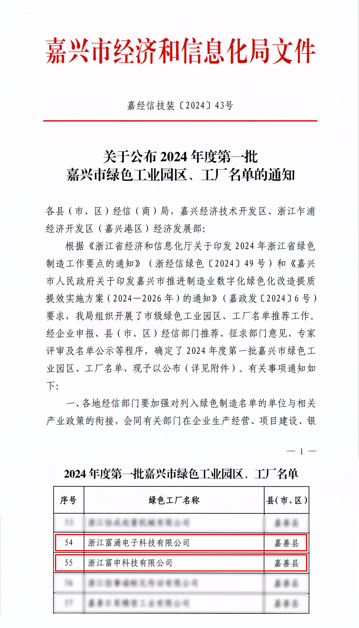 Recently,Jiaxing Economic and Information Bureau announced the list of the first batch of Jiaxing green industrial parks and factories in 2024,and DKE Zhejiang Fuyong Electronic Technology Co.,Ltd.and Zhejiang Fusheng Technology Co.,Ltd.were selected for the list and won the honorary title of"Green Factory"in Jiaxing City.