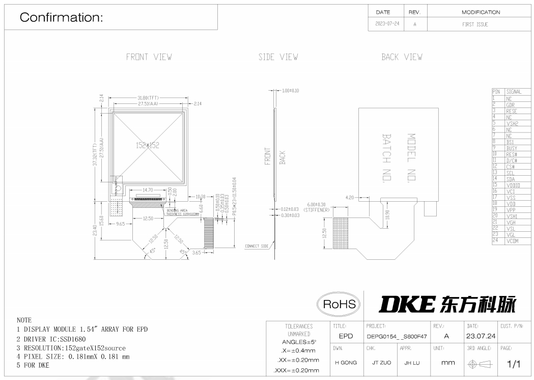 DKE 1.54 Inch Black White E-paper Display